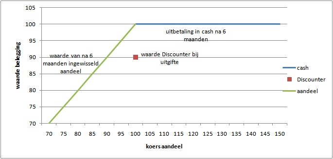Stel de koers van een aandeel is 100. Een Discounter is een product met een looptijd van 3 of 6 maanden, dat wordt uitgegeven met een lagere koers dan de 100 van het onderliggende aandeel. Als aan het eind van de periode de koers van het onderliggende gelijk of hoger is dan 100 krijgt men een bedrag van € 100 uitgekeerd. Als op de einddatum de koers lager is dan 100 krijgt men voor iedere discounter een aandeel. In het plaatje is de waarde van de Discounter met een looptijd van 6 maanden, zoals bij uitgifte en op de einddatum schematisch weergegeven.
