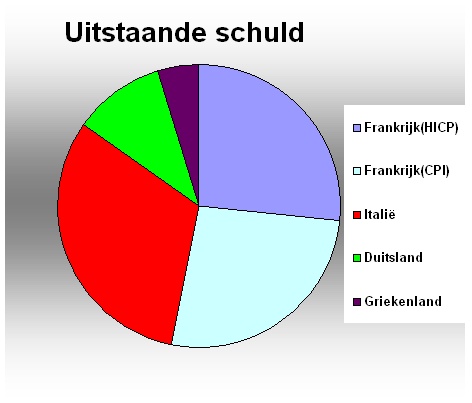 Er zijn maar vier landen in de Eurozone die omvangrijke inflation linked obligaties hebben uitgegeven. Totaal staat er ongeveer € 320 mrd uit en de grootte van de leningen varieert tussen de € 4 en € 25 miljard