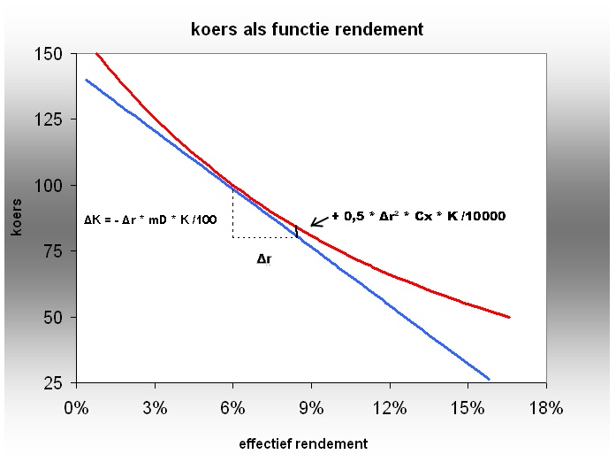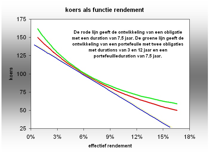 De tweede grafiek laat zien dat een obligatie met een hoge convexiteit zowel bij evenwijdige verschuiving van de termijnstructuur naar boven als bij een daling van het effectieve rendement aantrekkelijker is dan en obligatie met een lage convexiteit. Een grote convexteit verkrijgt met door een obligatieportefeuille met een grote dispersion samen te stellen.